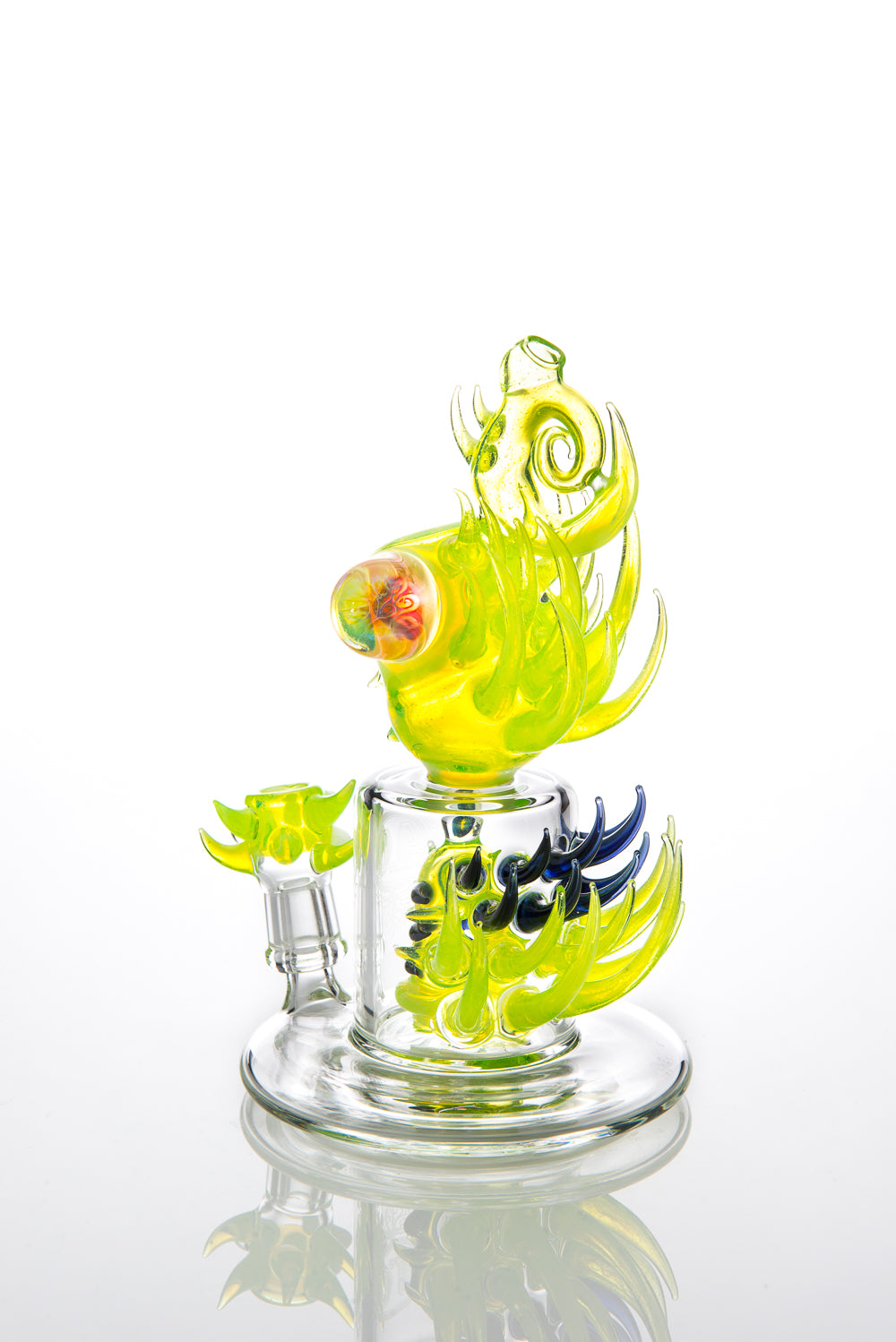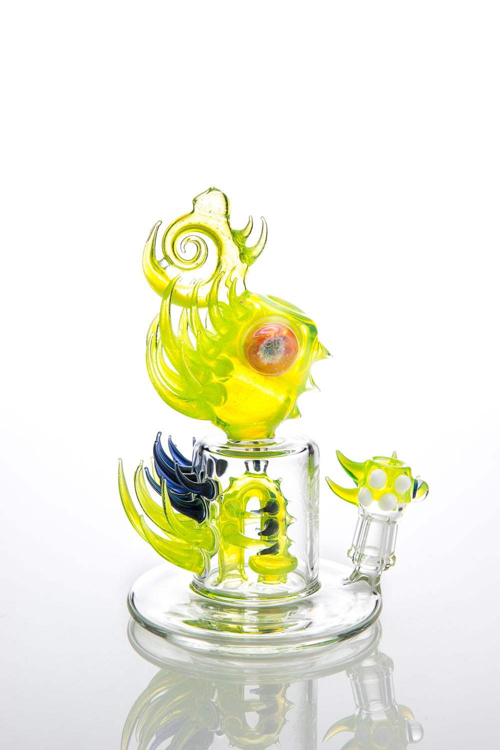 Bringing old with a bit of new is exactly what this 4.0 E4cer vapor bubbler is all about. Freeek!, known for his brain marbles, exquisite horns, and disc flips crushes this collab with a slime Sherlock that acts as the mouthpiece to the rig. The En4cer also features 4.0 millies located on the top of the percolator and on the matching dome. Looking closely at the hollow foot base, you will find both signatures of these industry-changing artists.