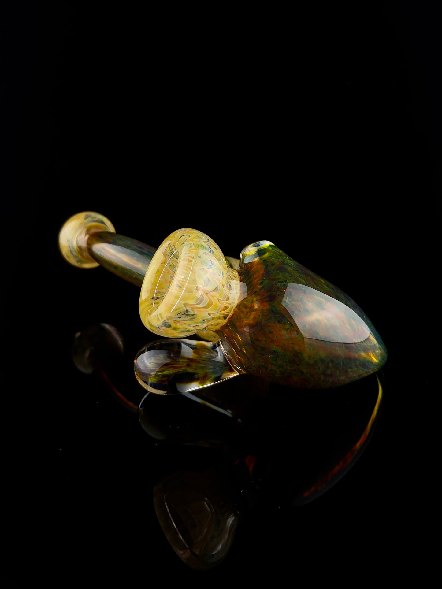 Five sections of fume work and frit come together to make this unique little beauty! Features an implosion marble which can also function as a kickstand.