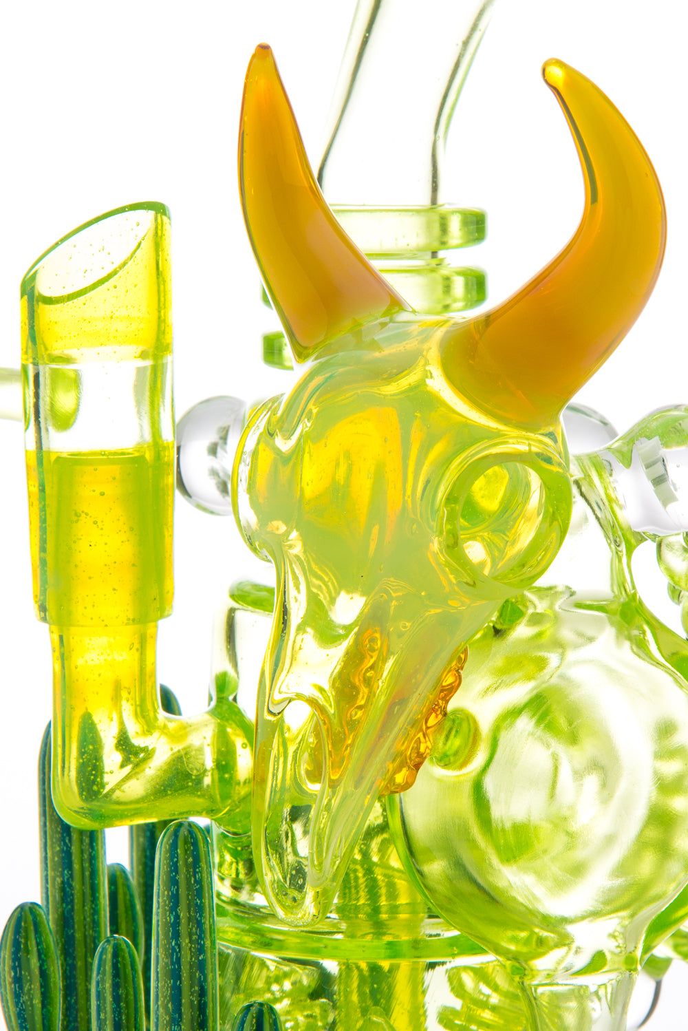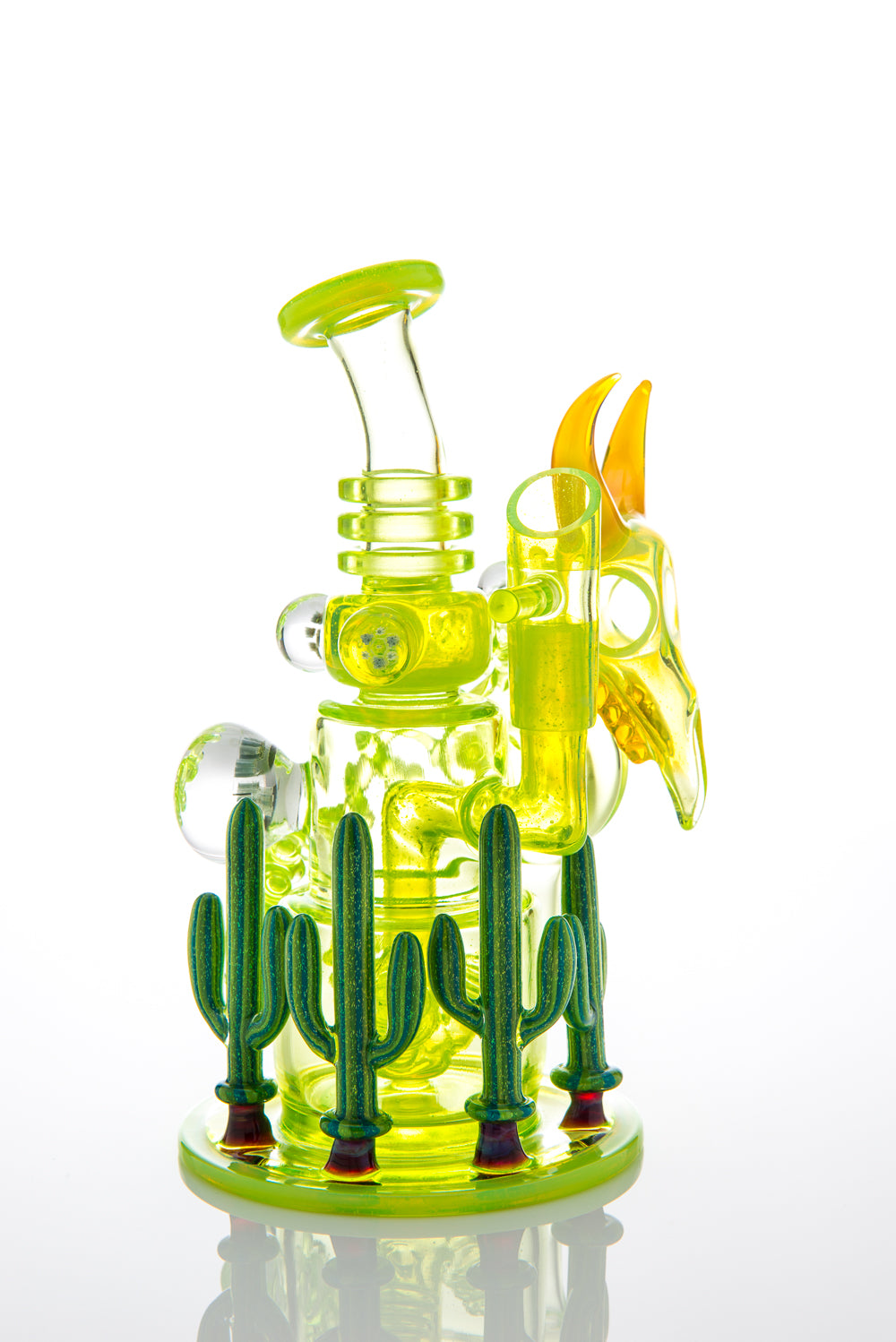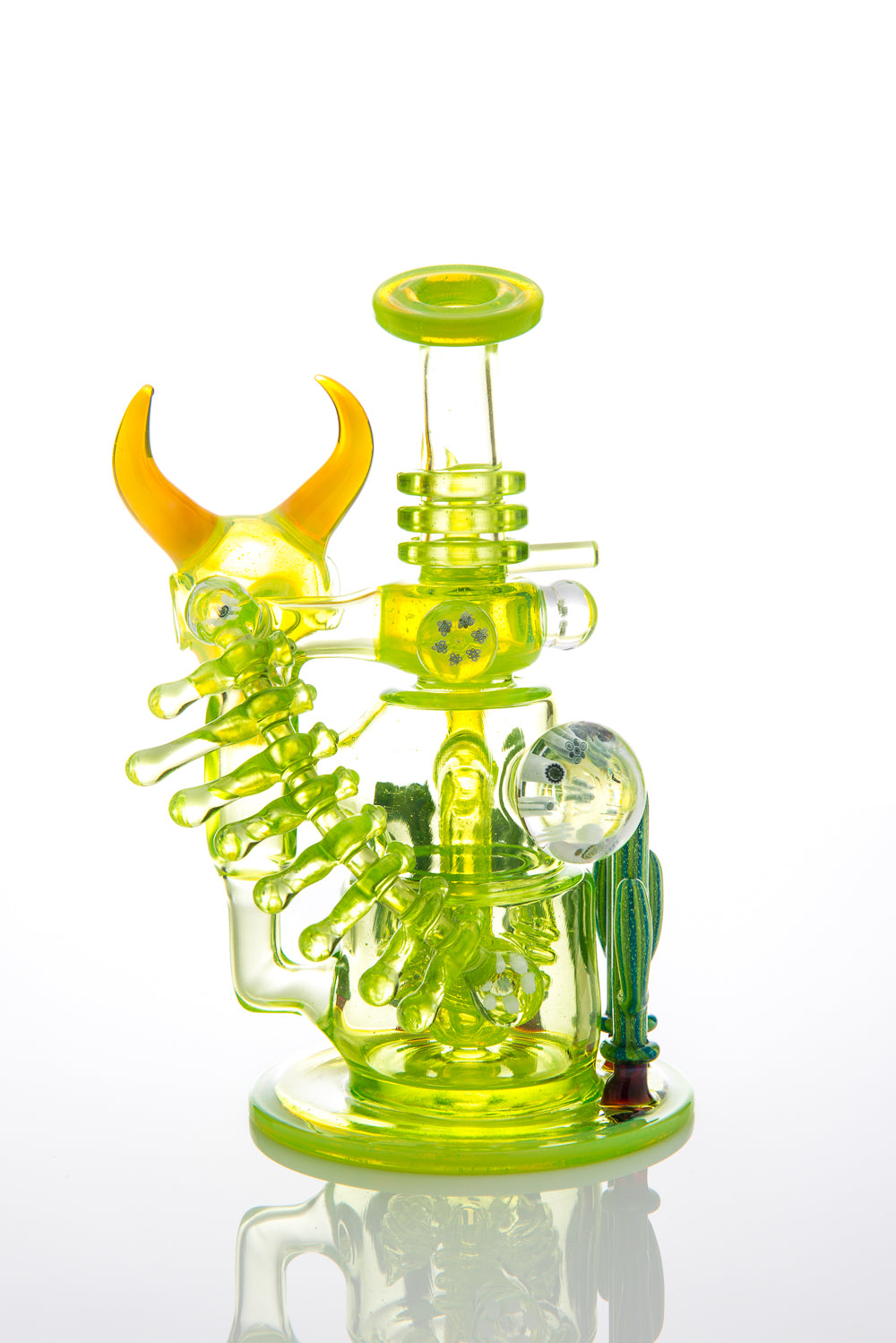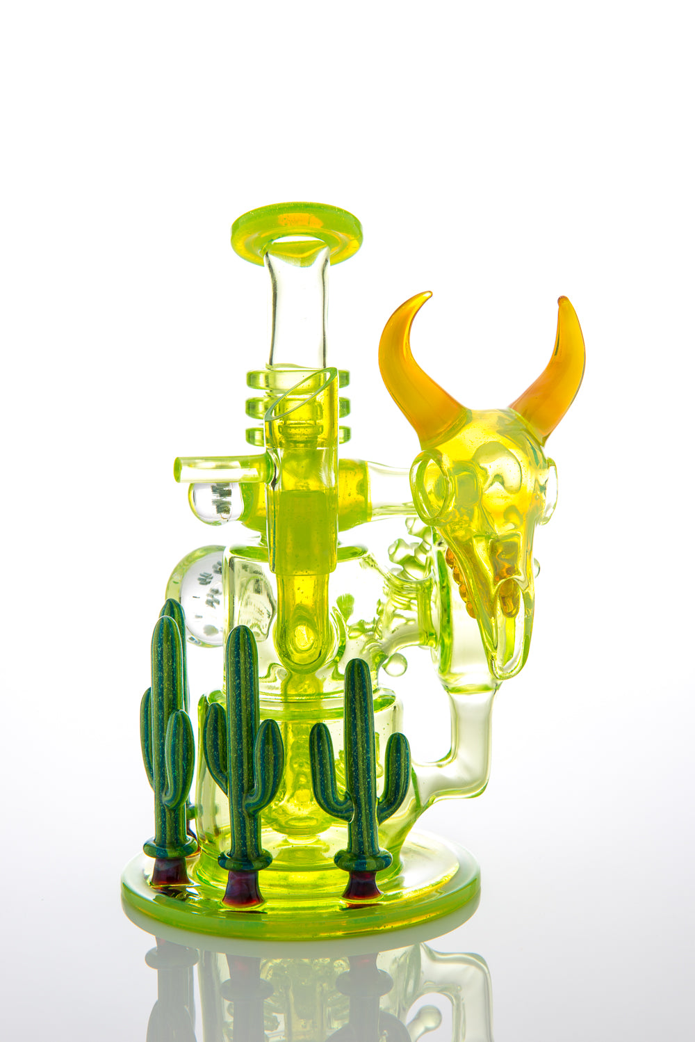 "The Desert Scene" or, as we jokingly refer to it "Candelas Nights," is a stunning collaborative effort between Ill Glassworks and some of the most highly respected artists in the functional glass scene--Buck, Darby Holm, Adam G, and Jason Lee. Built onto the award-winning Flux Cycler, this one-of-a-kind piece was the product of Illuzion Glass Galleries' annual 4/20 Party in 2014. Jason Lee worked his magic with millefiori, including a UV-reactive color in some of the focal marbles. Ryan "Buck" Harris created one of his sculpted cow skulls using Honey Money from Northstar Glassworks and attached it to the recycling disk. Adam "Adam G" Grafius completed the skeletal cow body with his precision shaping of the vertebrae, while Darby Holm put the finishing touches on the base with his signature dichroic green cacti. The entire event is well documented in Hot Breath Magazine vol. 13 http://issuu.com/hotbreathmagazine/docs/hb13-v6-issue, go check it out for yourself to catch the vibe of the evening!