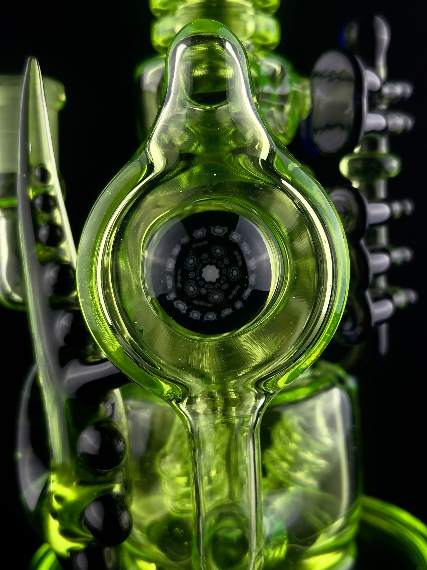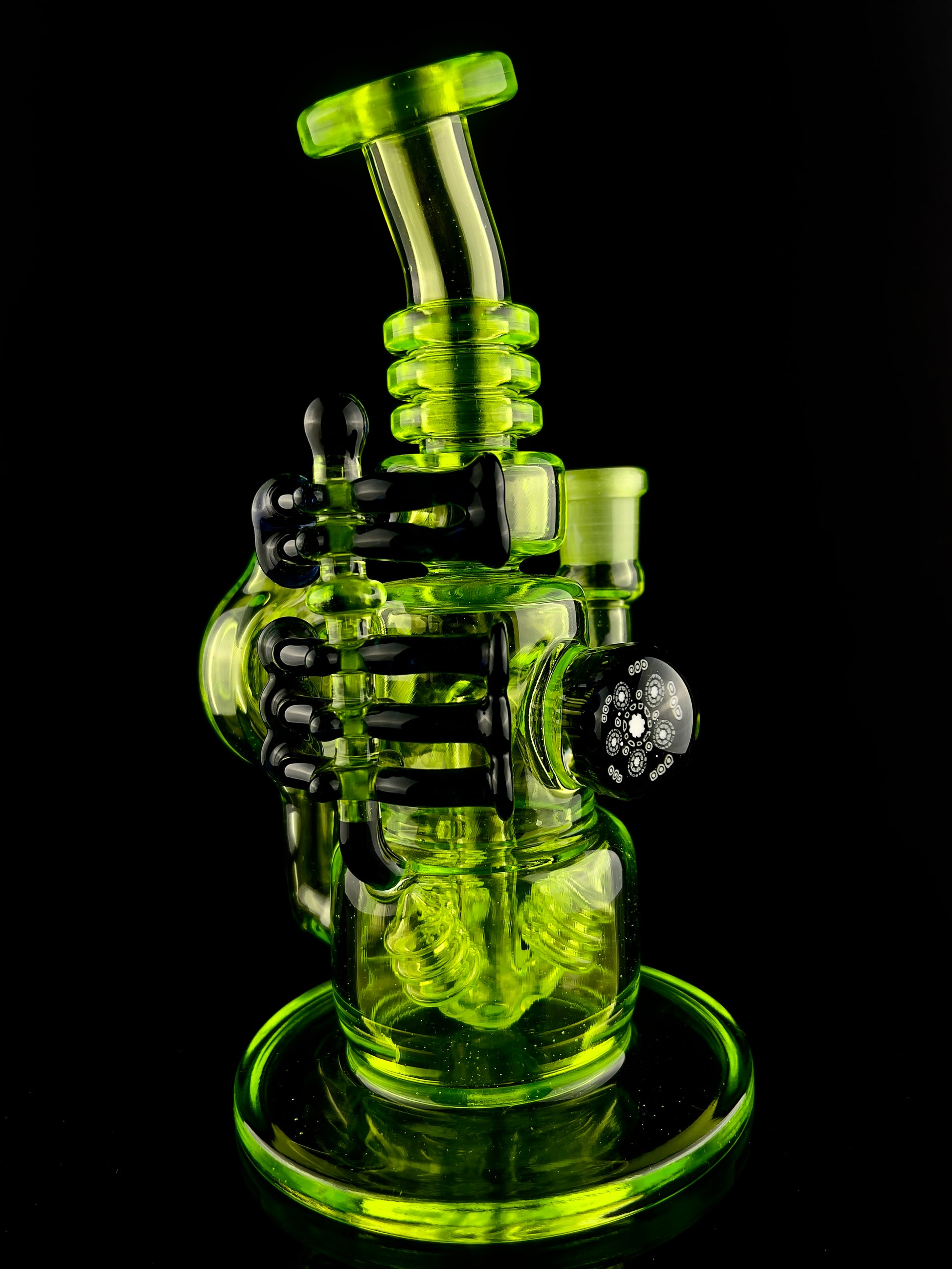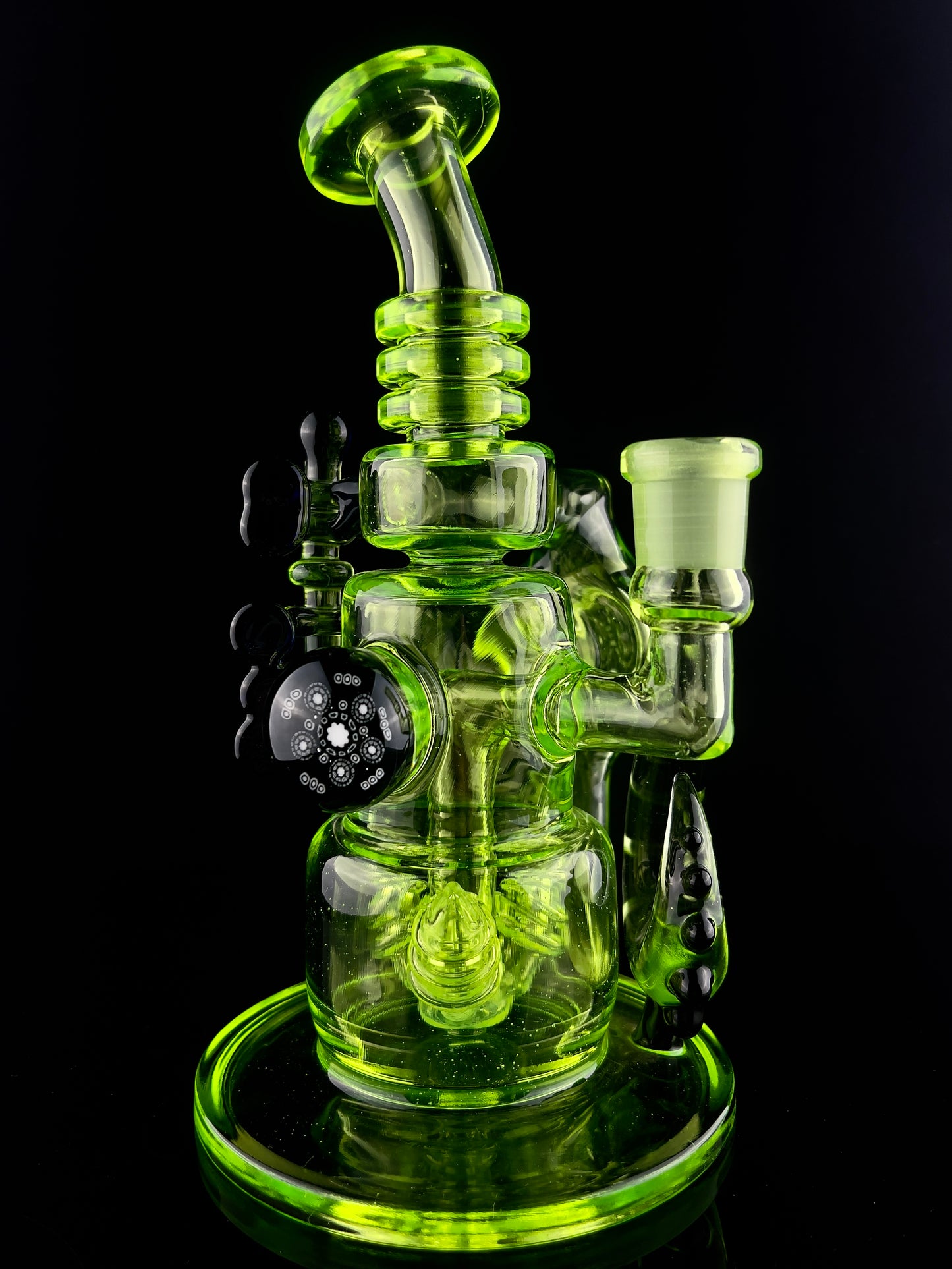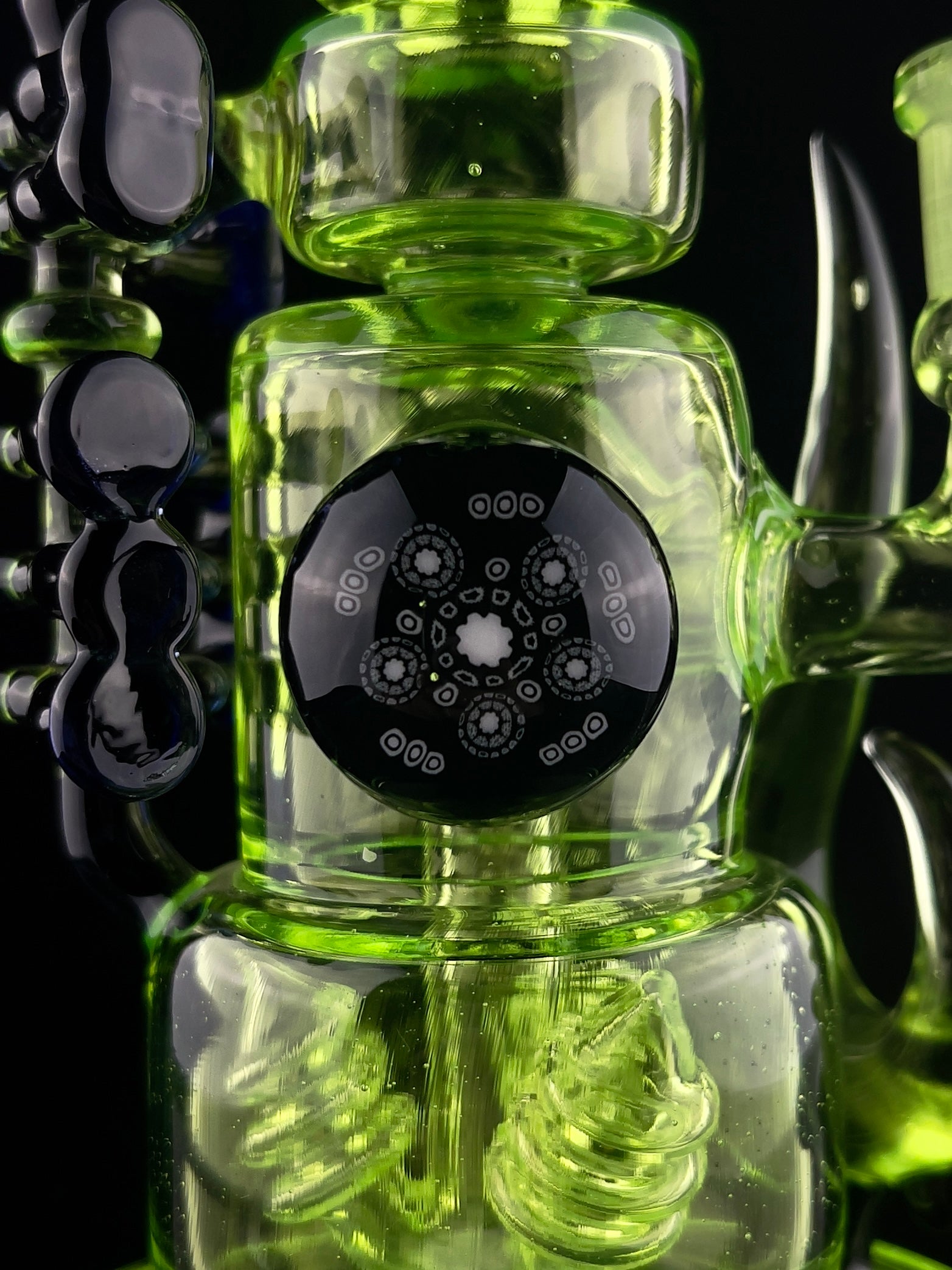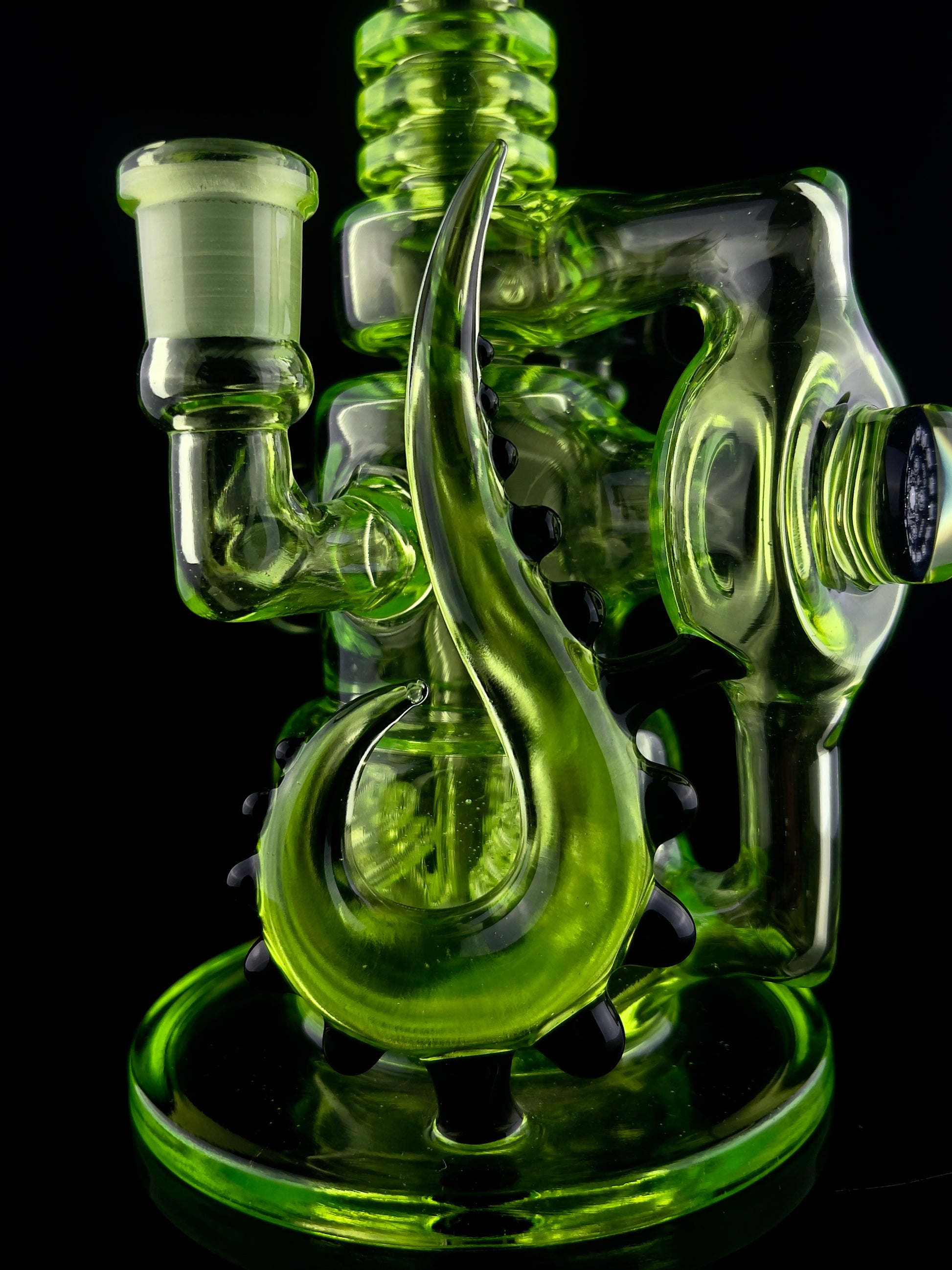 This stunning collaborative effort between ILL Glassworks and some of the most highly respected artists in the functional glass scene - Buck, Darby Holm, Adam G, and Jason Lee - was the product of Illuzion Glass Galleries' annual 4/20 Party in 2014. Built onto the award-winning Flux Cycler this one-of-a-kind piece has Jason Lee UV-reactive/glow-in-the-dark millefiori color in the focal marble on the recycler disc. Ryan "Buck" Harris and Darby Holm worked together to create a spinal structure and rib cage. Adam "Adam G" Grafius completed the piece with sublime and black tentacle-like horns. The entire event is well documented in Hot Breath Magazine vol. 13 http://issuu.com/hotbreathmagazine/docs/hb13-v6-issue, go check it out for yourself to catch the vibe of the evening!