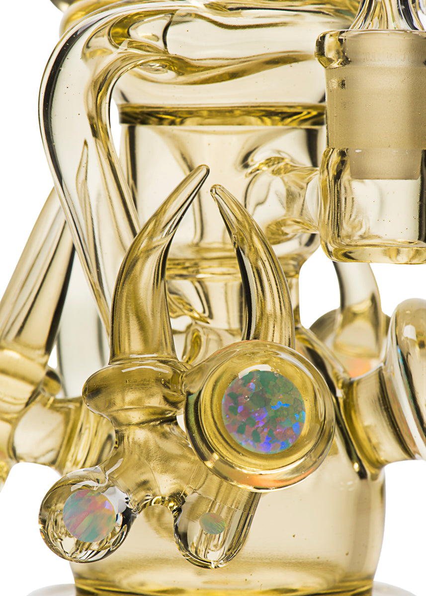 Made at the Satellite's initial debut from Ill Glassworks this piece is a collaboration between them and Big Z. Made entirely from Glass Alchemy's Serum glass, which is CFL-reactive, and changes from golden yellow to pink under fluorescent light. This particular Satellite serves as a base for solo artist Big Z's signature accents and opals, it was finished by Big Z in a public lampworking demo at Illuzion Glass Galleries' December 2016 First Friday party. If you're in the area, stop by and take a look, it is truly jaw-dropping in person.