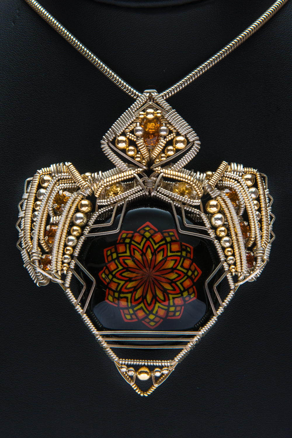Collaborations with Jason Burruss never cease to amaze. This talisman pendant features Bo Howe's amazing fillacello work in red, black, orange, and yellow. Jason wraps the pendant in .925 Argentium silver and 14 karats yellow gold. There are also 9 Madeira and golden citrines throughout the wrap. The pendant collaboration is named the "Star Firefox Talisman."